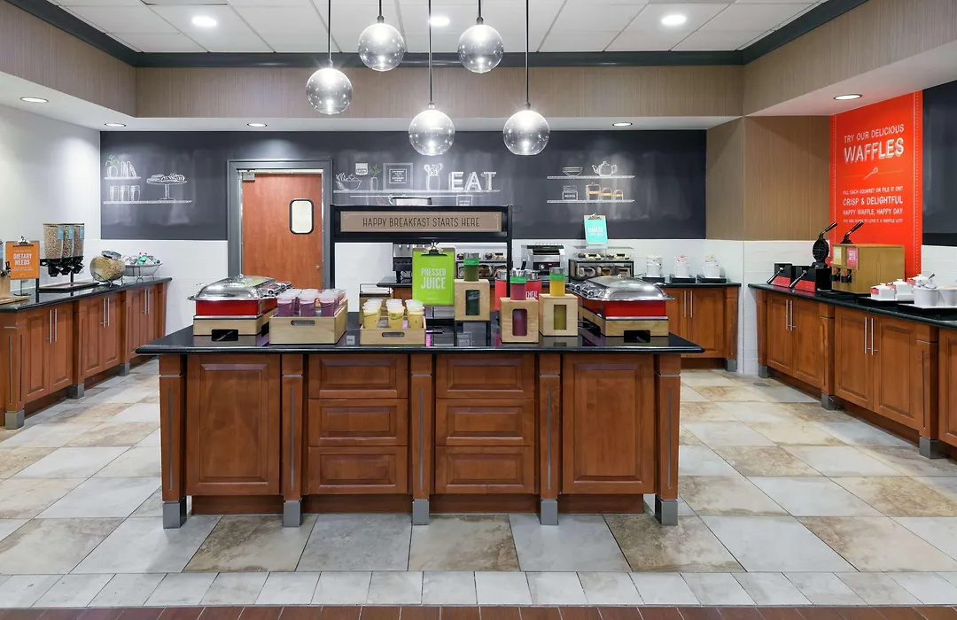 Guests can enjoy a daily free hot breakfast featuring items like coffee and DIY waffles. The hotel also has a lobby bar open daily from 5 PM to 10 PM, and nearby chain restaurants include Bonchon, IHOP, and TGI Fridays, all within walking distance.