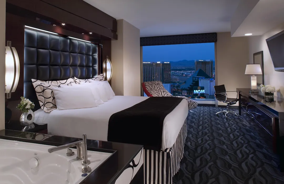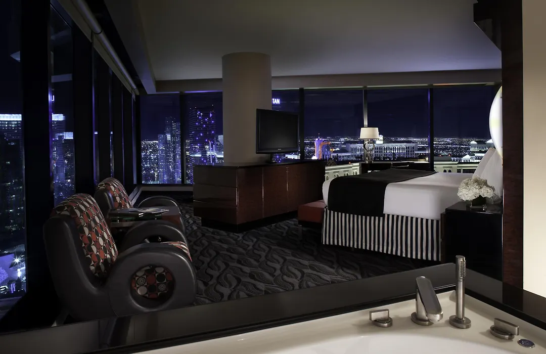 The hotel comprises 1201 rooms, all featuring premium bedding, air conditioning, and flat-screen TVs. Suites offer additional amenities including kitchenettes, microwaves, and spacious layouts with spectacular views of the Strip and mountains.