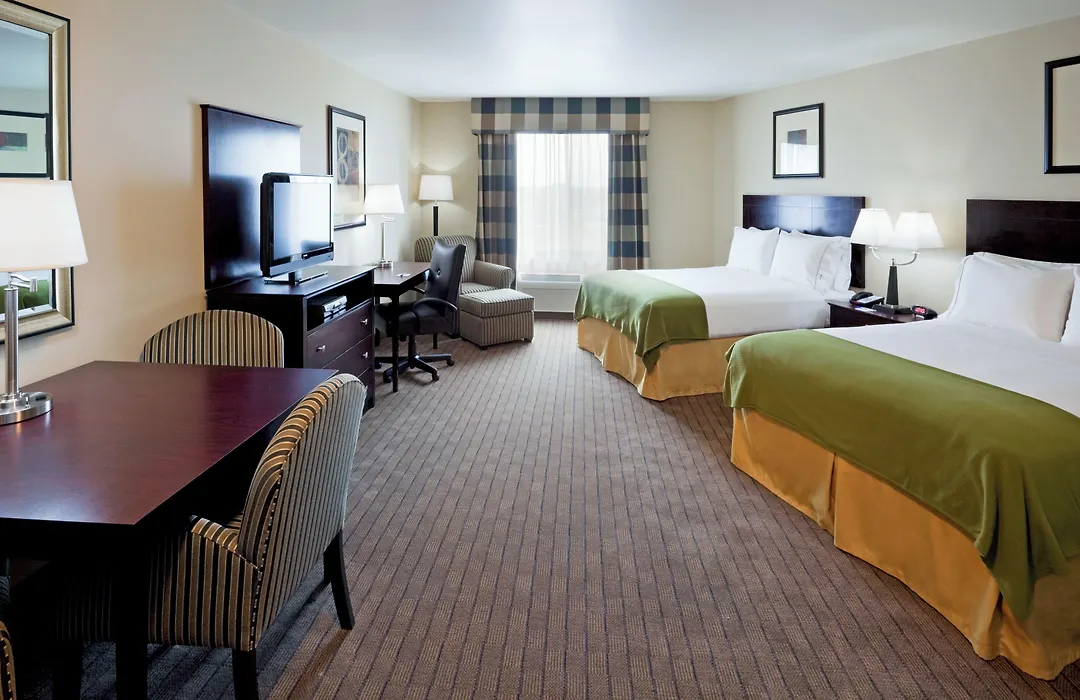 Rooms at Holiday Inn Express & Suites Syracuse North include queen and king beds, 32-inch HDTVs, Keurig coffee makers, and desks. The spacious suites also offer microwaves, refrigerators, and pullout sofas, making them suitable for families.