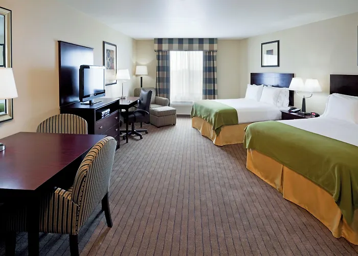 Holiday Inn Express features a complimentary hot breakfast with eggs, meats, bagels, and cinnamon rolls. Nearby dining includes Cracker Barrel and Dinosaur Bar-B-Que, noted for being named the best barbecue in America by Good Morning America.