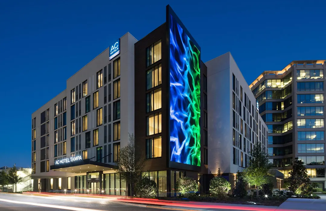 Ac Hotel By Marriott Tampa Airport is a 4-star pet-friendly hotel designed for busy travelers, featuring a sun terrace, outdoor swimming pool, and 24-hour fitness center. It offers free Wi-Fi and a convenient free roundtrip airport shuttle.