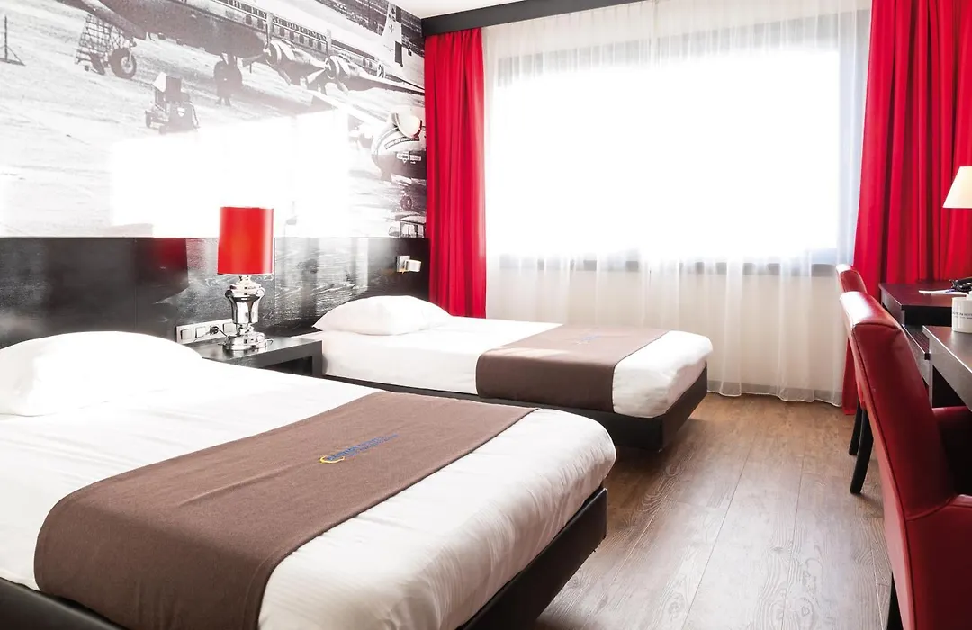 The hotel features services like a 24-hour front desk and free public parking. Transportation includes a bright-orange shuttle bus that runs every 30 minutes between the hotel and Schiphol Airport.
