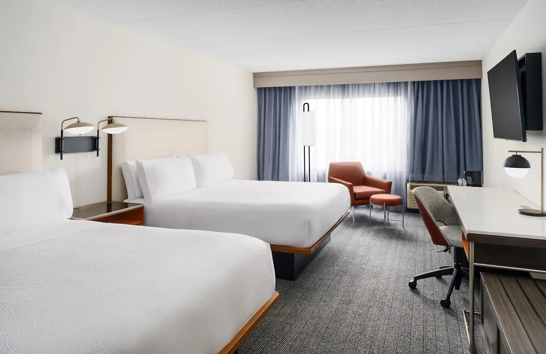 Rooms at Courtyard Chicago Midway Airport include a flat-screen TV, coffee maker, and ergonomic workspaces with plush Marriott bedding. Free Wi-Fi is available throughout the hotel.