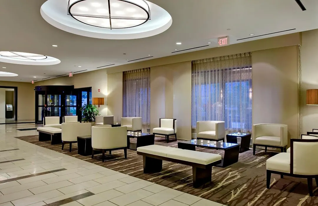 The hotel features three on-site dining options, including Chicago Fire Oven and On the Fly, which serve a variety of American cuisine. Dining can be casual or fine, catering to different preferences throughout the day.