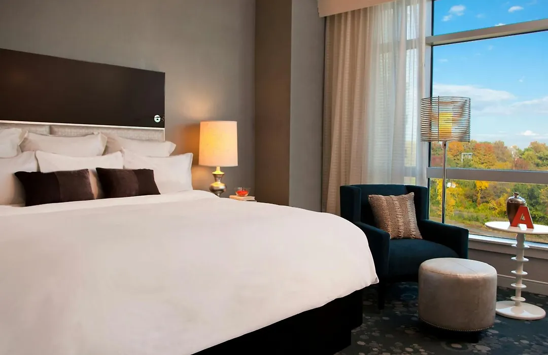 Rooms at Renaissance Arlington Capital View Hotel are spacious and soundproof, featuring modern amenities such as flat-screen TVs, high-speed Wi-Fi, and organic Aveda products. Many rooms provide stunning views of the Arlington skyline or Reagan National Airport runway from oversized windows.