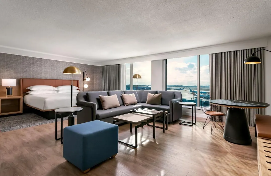 Every guestroom features premium bedding, air conditioning, and flat-screen TVs with streaming services. Reimagined suites provide runway or city views, making it comfortable for both work and relaxation.