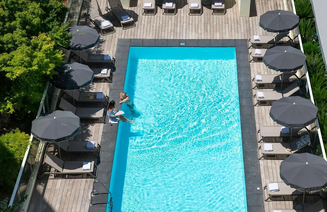 Novotel Suites Nice Airport (4-star) features modern suites designed for extended stays, offering amenities such as air conditioning, free WiFi, and a kitchenette. The hotel includes an outdoor pool, a bar, and a fitness center accessible 24/7. It holds an 8.5/10 rating on Booking.com.