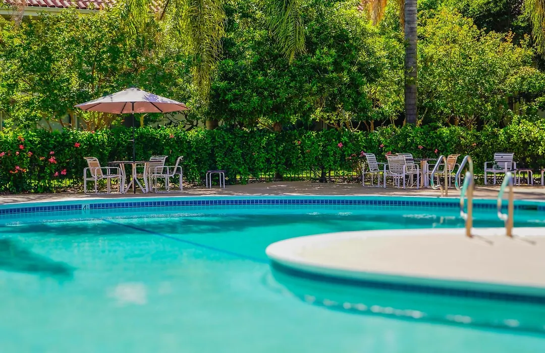 Recreational amenities include a large outdoor pool, hot tub, and exercise room. There are also a putting green and a poolside bar for relaxation and leisure activities.